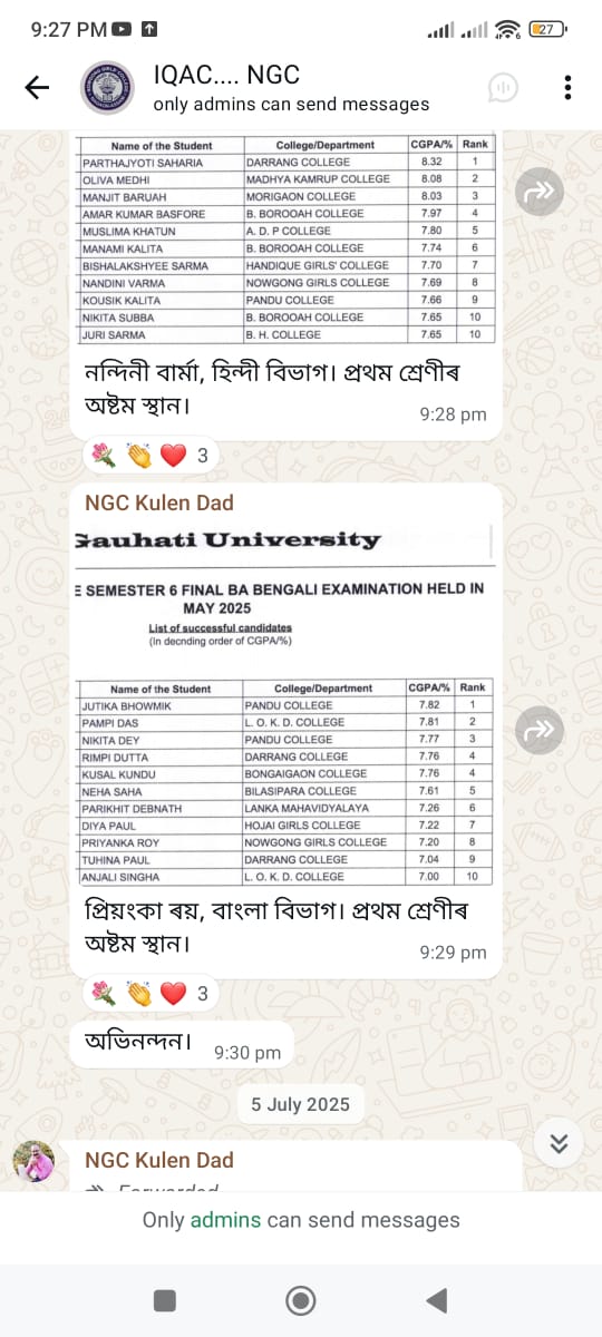 | 290 | Lecture Programme, 2019 | One Day Lecture Programme on “Bangla Banan” Organised by Department of Bengali, Nowgong Girls’ College on 18.11.2019. Resourse Persons : 1. Dr. Sanjay De, Associate Professor and HOD, Bengali | 2019-12-11 | View File |